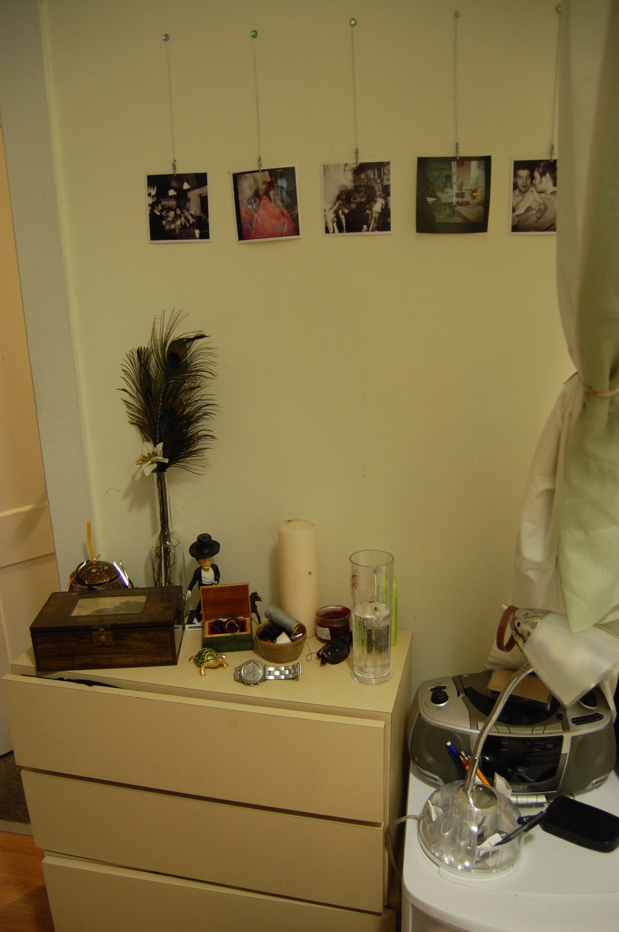 Also lacking a bit. Fitting. I used to have a fancy rhinestone mirror over there but I kept knocking it down so I decided to forego all romantic prospects to avoid seven years of bad luck. Also notice the plaster issue again, those damn photos will not stay up no matter what I do.