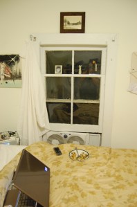 Aside from how stupid it is for me to still have a window fan, we’ve got some artwork, a framed picture of Kevin Arnold, a cat sculpture from Kenya, and this is mostly where my computer lives. Along with my dinner, tonight it was home fries (yum). I like the idea that my creative section is also where my window is. See ya later, didn’t need you anyways.
