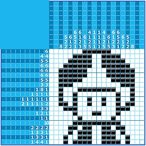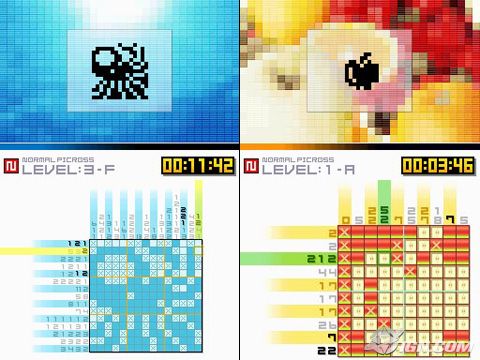Picross DS was released for the Nintendo DS in 2007; it employed a 2-dimensional grid that was numbered along the X and Y axes.  Reading the numbers in an almost numeric logic problem process of elimination allows you to see which boxes on the grid are to be highlighted and which are to be deleted (marked with an X).  Once all of the extraneous boxes have been deleted, the highlighted boxes will form a picture.