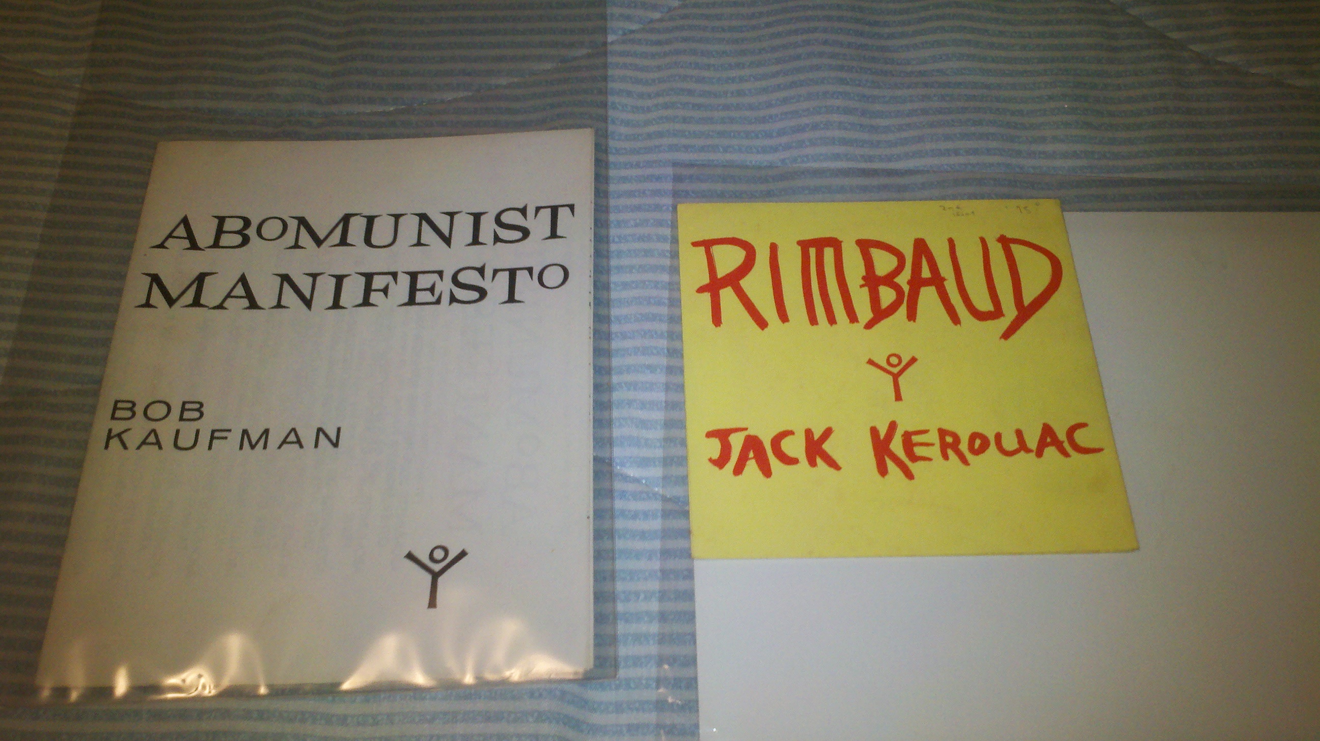 Copies of Bob Kaufman’s “Abomunist Manifesto” and Kerouac’s translation of Rimbaud.