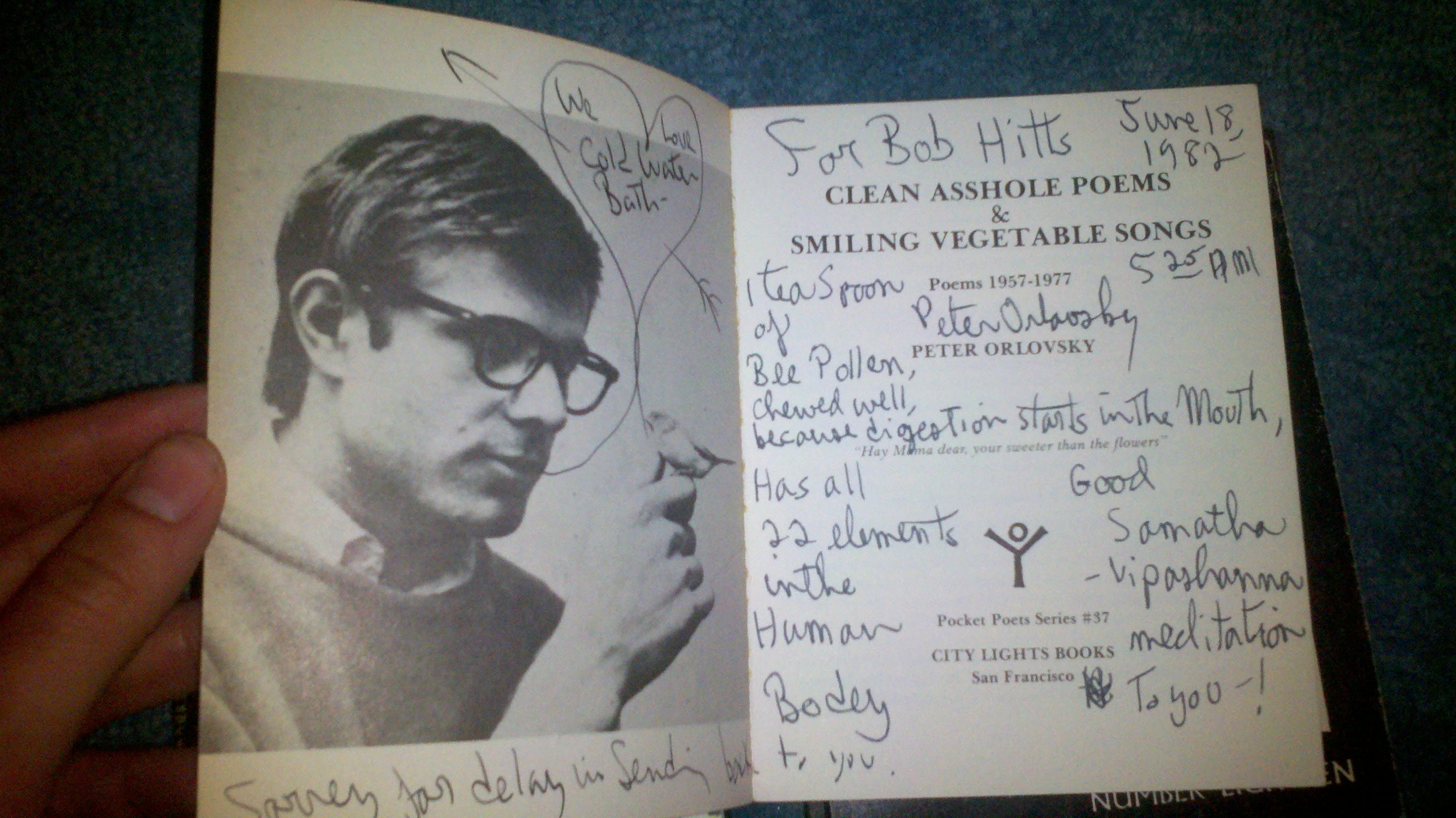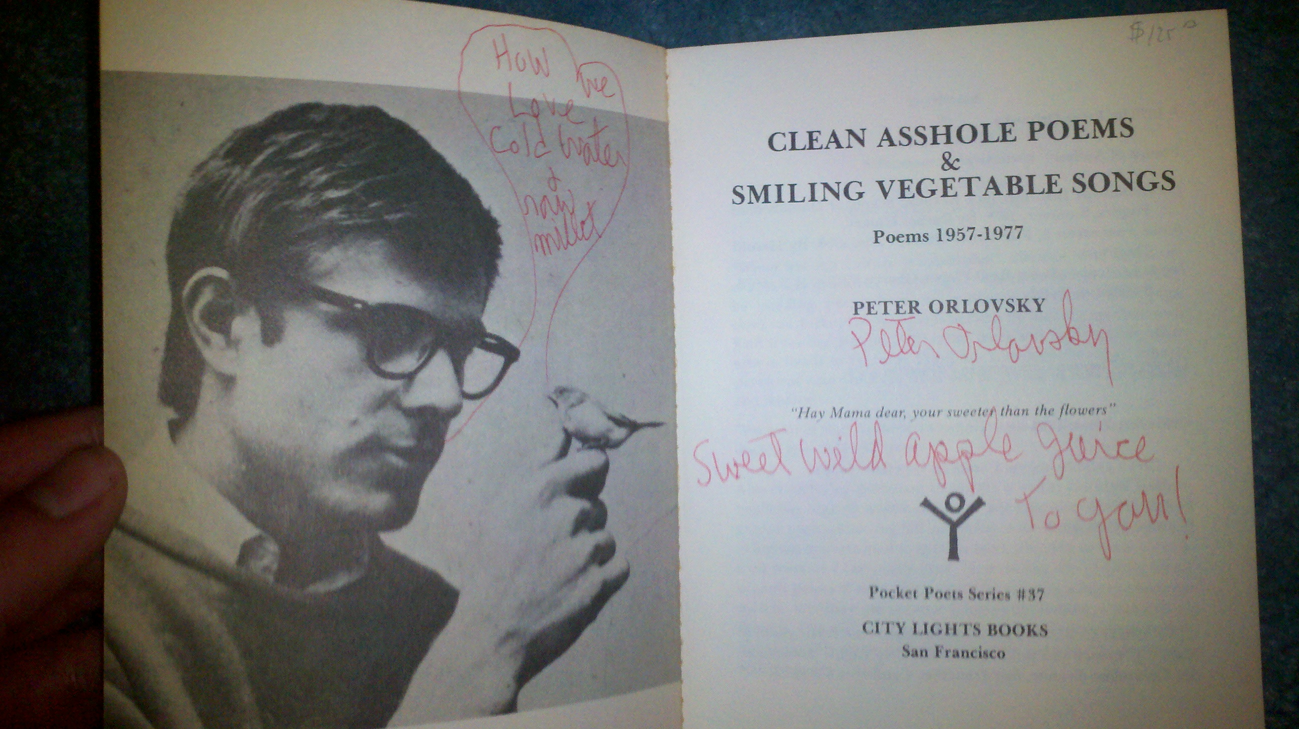More interesting than signatures are personalized inscriptions. Here are two inscriptions in firsts of Clean Asshole Poems & Smiling Vegetable Songs from Ginsberg’s life partner and fellow poet, Peter Orlovsky.