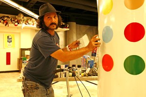 Secondly, let us examine the film itself (and I will spoil shit for you here, if you haven’t seen the movie). The movie follows Thierry Guetta (seen above) as he, in turn, follows his street-artist cousin Invader. Through Invader, Guetta meets Shepherd Fairey (self-proclaimed phenomonologist and creator of the icon Obey “brand”) and Banksy (London street-artist and cheeky fuck), and eventually becomes an artist himself, Mr. Brainwash. Interlaced with interviews from the established graffiti artists aforementioned, we watch as Mr. Brainwash becomes progressively more ingratiated into the “underground” world of street-art (and by “underground” I mean totally not even slightly underground). He shamelessly appropriates, creates a brandname out of himself, and effectively murders everything a true artist would hold sacred. I think of a scene in the film when people are lined up around the block waiting to get into a Mr. Brainwash gallery opening and, when they are asked why they are here and what they want to see, nobody has any idea. The general consensus seems to be that, if this many people want to see something, it must be worth seeing. Exhibit B: Banksy is a cheeky fuck.