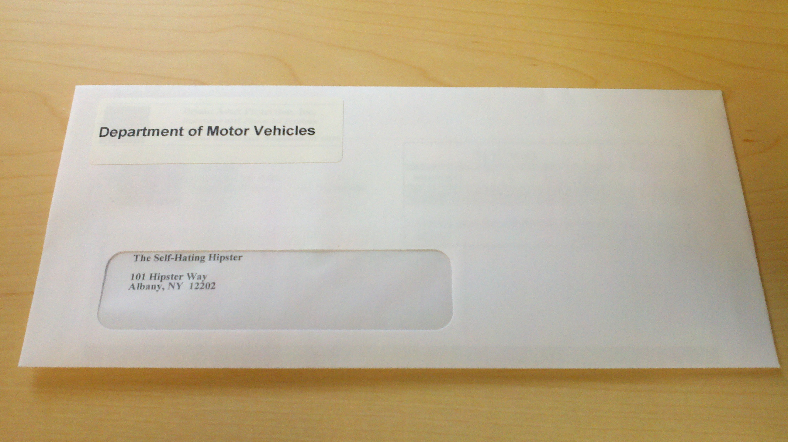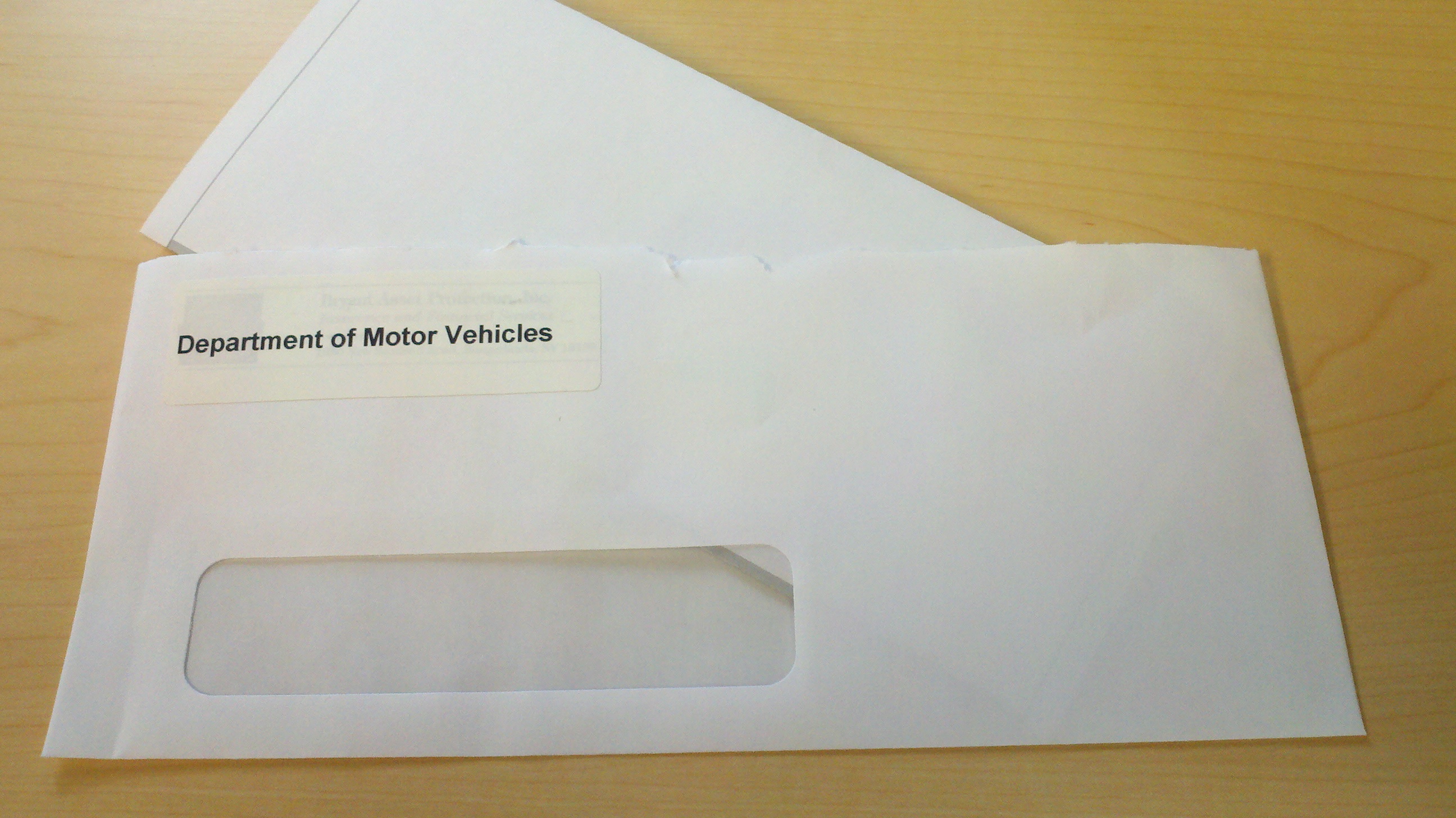 Step 1: Select the most annoying piece of mail in your pile. In this case, I had a vehicle registration renewal invoice from the Department of Motor Vehicles to the tune of $58. I have recreated the DMV letter below.