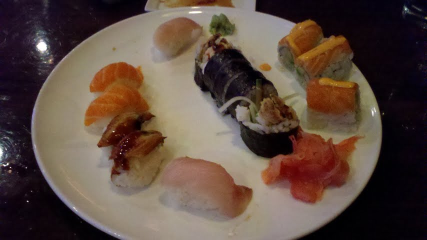 I again let my hunger get the best of my memory and myunched half the plate with Rachel before I took a picture. Trust me, the plating was gorgeous before the mau-ing. A Spider Roll, a Sunshine Roll and 2 salmon, 2 white tuna, 2 more eel, 1 red snapper and 1 shrimp.
